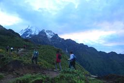 Today’s trek begins with a steady climb through forested terrain toward High Camp. As you gain altitude, the vegetation starts to thin and the first clear mountain views begin to appear. The trail continues along a scenic ridge past Badal Danda, where clouds often float below the trail, creating dramatic scenery. From here, the route ascends above the tree line into alpine terrain with spectacular views of Machhapuchhre and the Annapurna range. After several hours of ridge walking, we will arrive at High Camp, which offers breathtaking sunset views over the Himalayas.